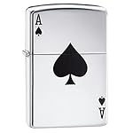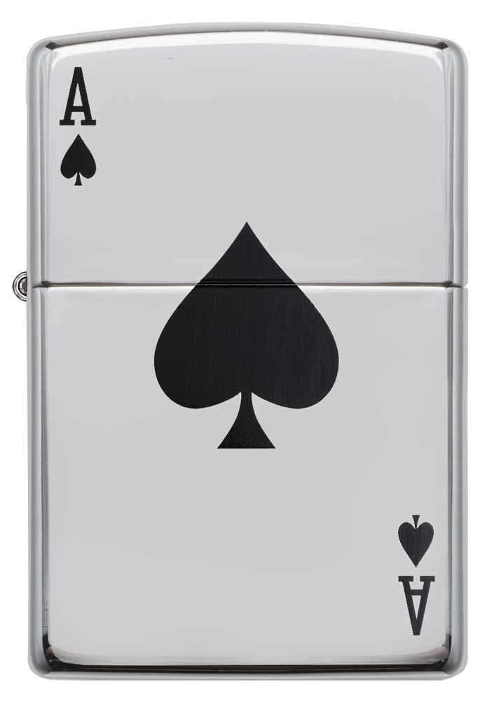 A Zippo lighter with a bare metal, polished Chrome, classic size case, finished with a lucky Ace design. This lighter requires fluid fuel. The lighter is supplied unfueled for safety during shipping.
